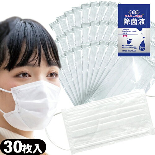 【あす楽発送 ポスト投函!】【送料無料】【個包装】3層構造 不織布マスク サイズ(約)縦95x横175mm (1枚入) × 30枚 + マイン携帯用アルコール配合 除菌液(2mL)×3枚セット - 大きさはふつうサイズ、 1枚ずつ個包装されていてるので衛生的。【ネコポス】【smtb-s】